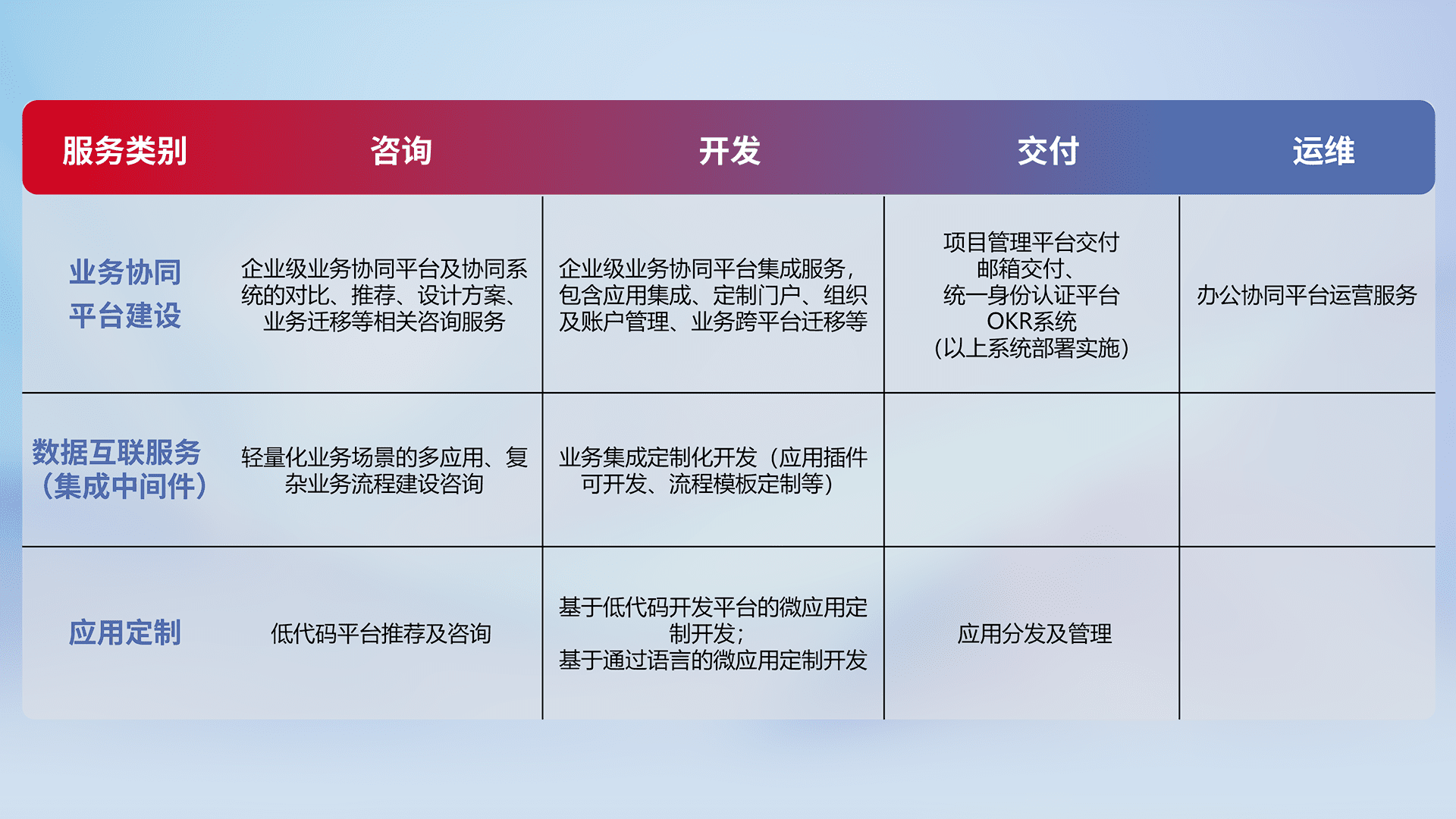 针对钉钉、、、企微、、、IDaas等平台级产品提供产品的规划、、、、方案、、、交付、、、定制化开发等服务,,,,实现如统一协同办公、、智能客户服务、、、混合会议管理、、、、智能数据查询、、、等业务场景,,,实现数字化转型。。。。