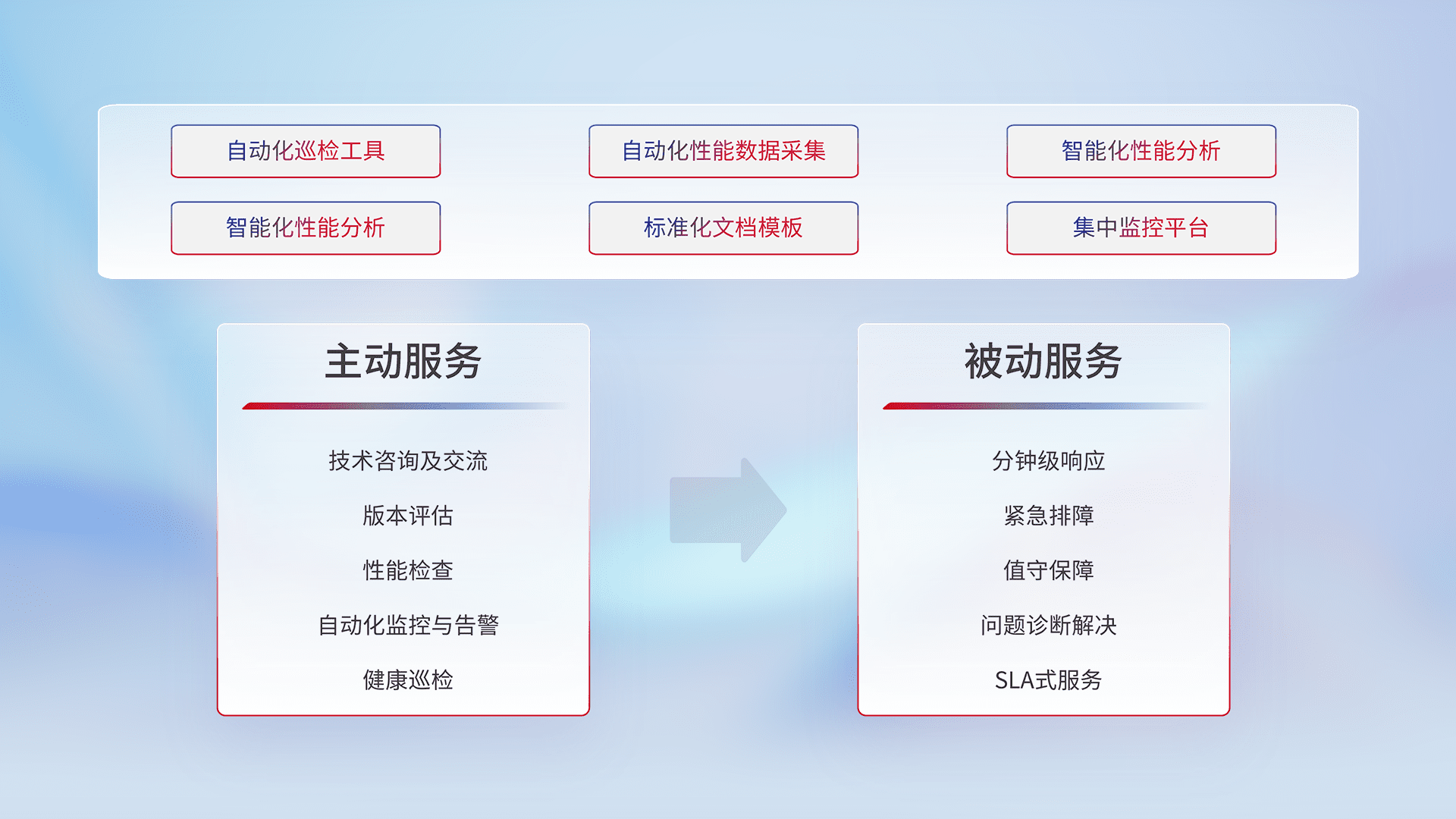 智能化工具和标准化文档,,保障服务质量,,提供主动服务(包含技术咨询、、、、版本评估、、、、性能检查、、、自动化监控与告警、、健康巡检)和被动服务包含(分钟级响应、、、紧急排障、、值守保障、、问题诊断解决、、、、SLA服务)。。